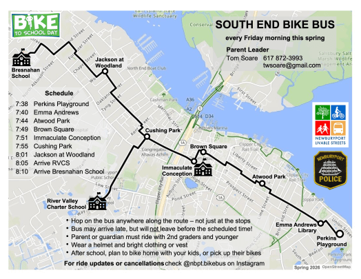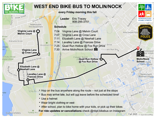 A bike bus is an organized bike ride through neighborhoods to a school. Starting on Bike to School Day 2025 (May 7) and continuing every Friday through the end of the school year, a group of parents and other adult volunteers chaperoned up to 75 children to the Bresnahan School. The riders and scooters ranged in age from pre-kindergarten to third grade. The 2025 bike buses were Newburyport’s first, and were outstanding successes. The Police Department enthusiastically assisted the riders.
