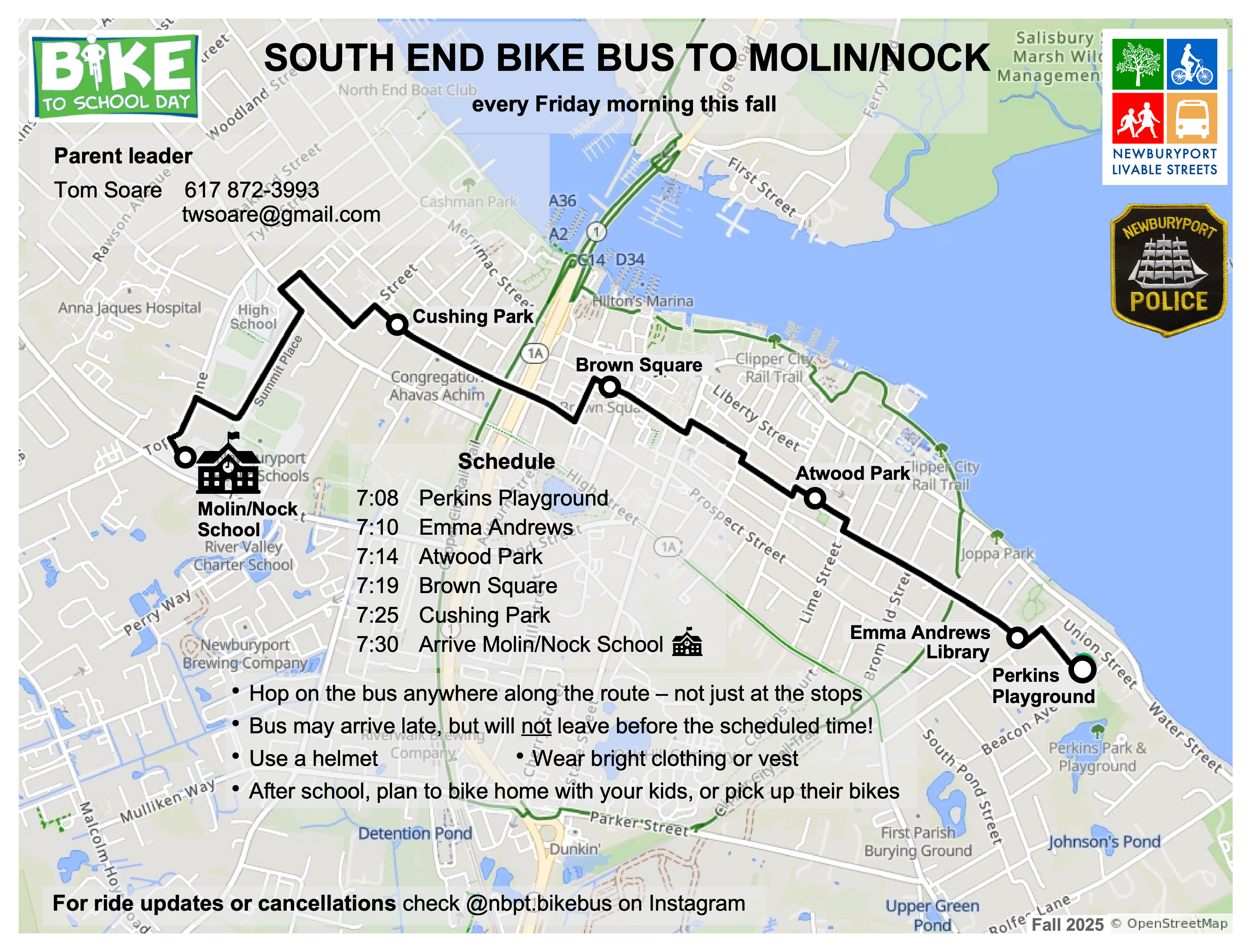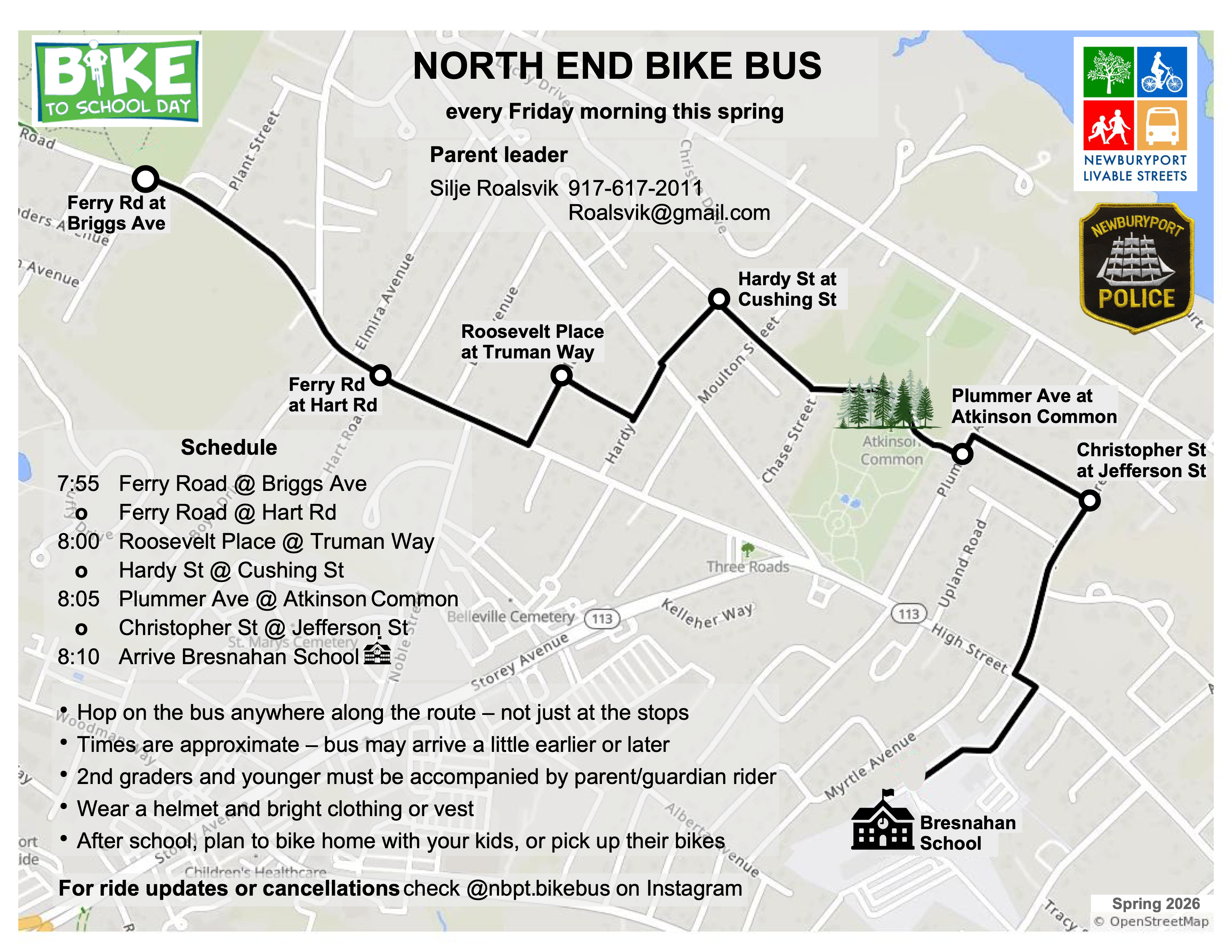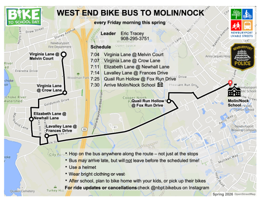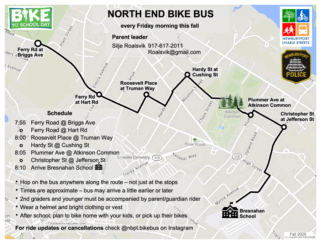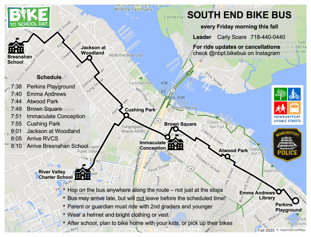 A bike bus is an organized bike ride through neighborhoods to a school. Starting on Bike to School Day 2025 (May 7) and continuing every Friday through the end of the school year, a group of parents and other adult volunteers chaperoned up to 75 children to the Bresnahan School. The riders and scooters ranged in age from pre-kindergarten to third grade. The 2025 bike buses were Newburyport’s first, and were outstanding successes. The Police Department enthusiastically assisted the riders.
